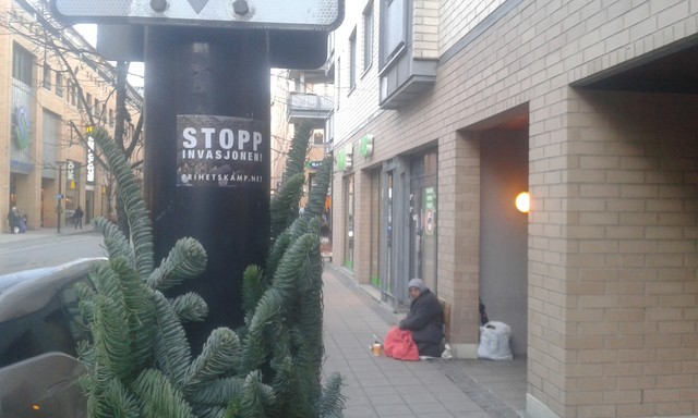 Aktivist fra Kampgruppe 101 har nylig hengt opp store mengder klistremerker i Sandvika sentrum.